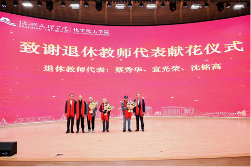 紧接着,校友代表胡柏藩、宣建耿、邵国成向退休教师蔡秀华、宣光荣、沈铭高献花,表达对恩师的深切敬意与感恩之情。化学05届校友舒兴中与82届校友胡柏藩作为校友代表回忆求学往事。舒兴中哽咽回忆了早年的学习经历,感念恩师们的辛勤付出与悉心指导为其学术道路奠定坚实基础;胡柏藩校友则回顾了在艰苦条件下锤炼技能的往事,强调母校培养的实践精神与系统思维对其日后创办企业产生了深远影响。两位校友的讲述虽跨越不同年代,却共同表达了对母校深沉的感恩之情与诚挚祝福。