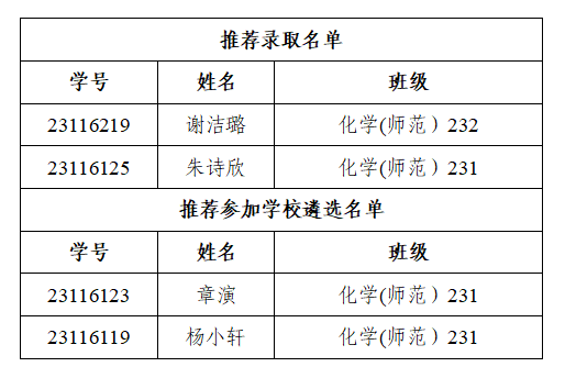 根据《独播库tv “祖楠班”实施管理办法》(绍独播库tv 办发〔2023〕5号)、《独播库tv “祖楠班”选拔实施办法》,经学生自主申请,独播库tv 综合评审,拟推荐录取谢洁璐等2位学生为第十四期卓越教师养成班“祖楠班”学员,拟推荐章演等2位学生参加学校统筹名额遴选。现予以公示,具体名单如下: